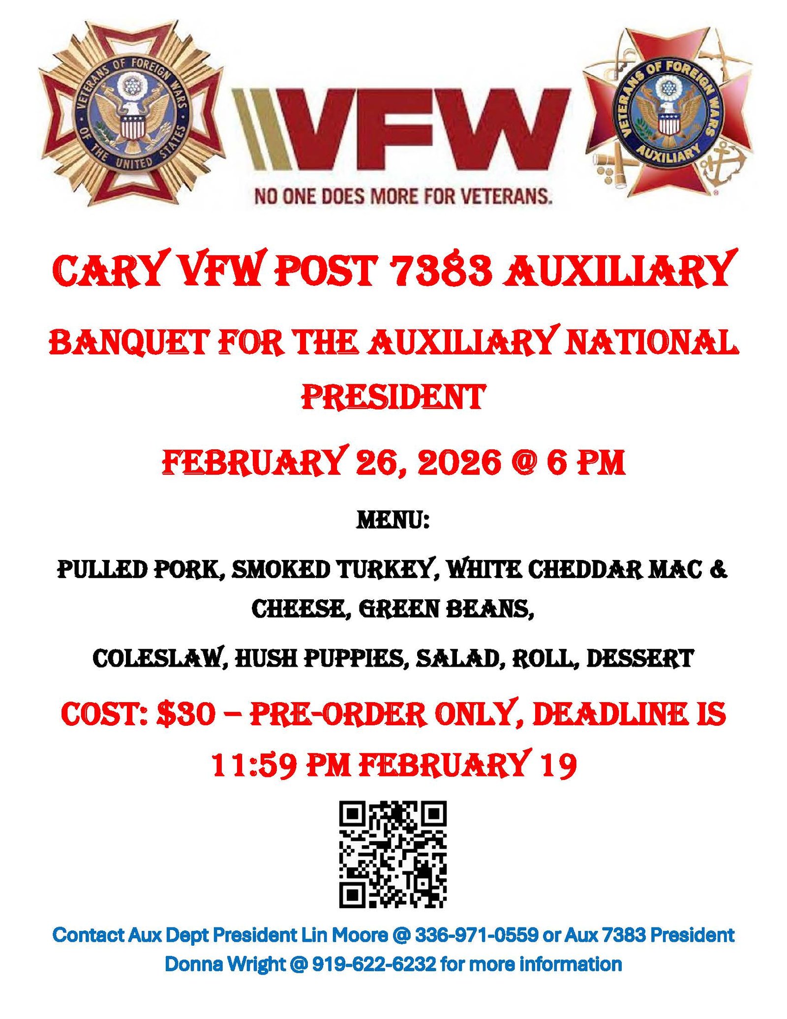 The Cary VFW Post Auxiliary is hosting a banquet for their National President on February 26. The cost is $30 per person, and all meals MUST be pre-ordered online by midnight on February 19 so the caterer can be paid on February 20.